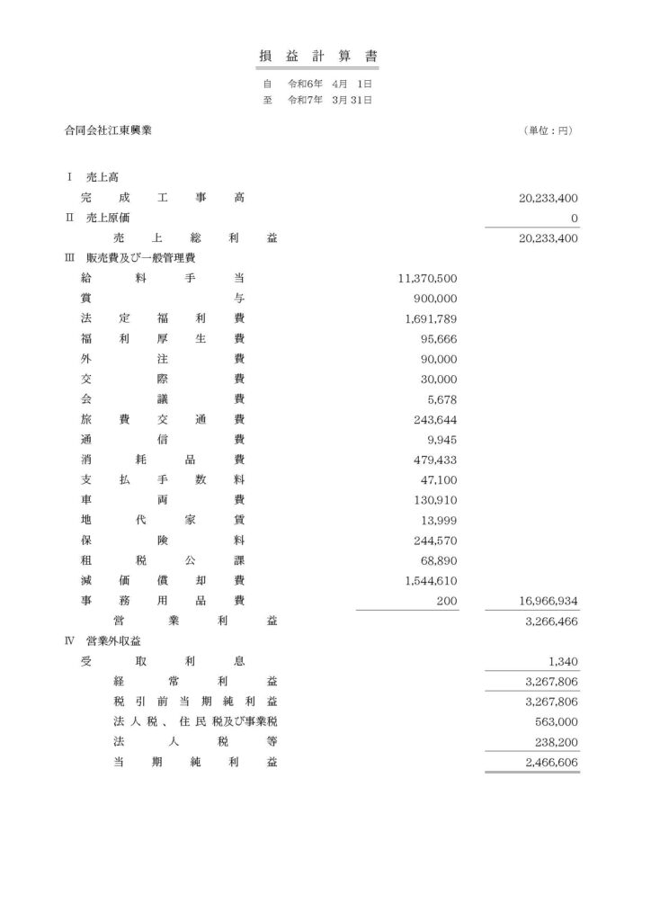 3名の代表社員(経営陣)に対する報酬は0円の為、損益計算書に役員報酬という項目は出てきません。