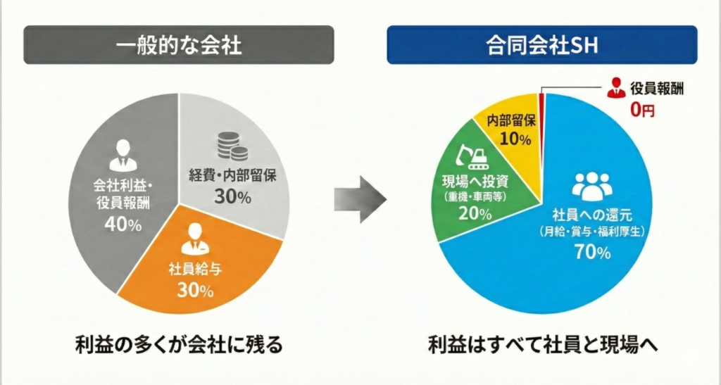 理由は、社員への還元と会社を成長させる投資(重機や車両等の購入)に使う為です。